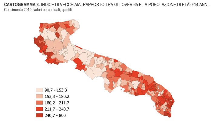 - l’indice di vecchiaia (che è dato dal rapporto tra la popolazione oltre i 65 anni e la popolazione inferiore a 14 anni) risulta disomogeneo sul territorio e molto alto, in particolare nella zona del Salento e del sub-appenino dauno;