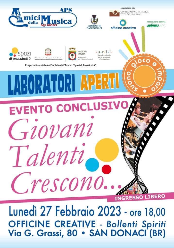 I "Laboratori Aperti" proposti dall’APS Amici della Musica di San Donaci, inseriti nel progetto “Suono, gioco e imparo”, si concludono con un grande evento finale dal titolo “Giovani Talenti Crescono...”.