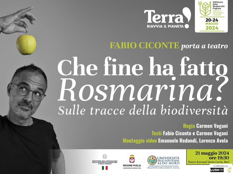 Il primo evento è in programma martedì 21 maggio alle ore 19.30 al Teatro Kursaal Santalucia a Bari. Lo scrittore Fabio Ciconte porterà in scena il monologo teatrale "Che fine ha fatto Rosmarina? - Sulle tracce della biodiversità", scritto insieme a Carmen Vogani  e basato su due libri “Chi possiede i frutti della terra?” (Ed. Laterza, 2022) e  “L’ipocrisia dell’abbondanza” (Ed. Laterza, 2023).