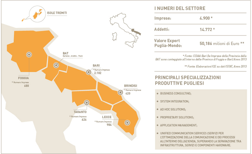 L’ICT pugliese si caratterizza per una filiera completa per i servizi digitali. Le aziende informatiche, infatti, sviluppano i loro prodotti coprendo aree di business differenti e complementari per la creazione di un solido valore aggiunto a vantaggio di tutto il settore. Questo processo è alla base della crescita di un sistema industriale che sta consentendo alle aziende di competere su nuovi mercati, sia nazionali che internazionali. Le impresi pugliesi lavorano per la realizzazione di soluzioni per la gestione delle risorse umane, per la produzione di sistemi telematici per usi diagnostici, la progettazione di applicazioni per il settore della sanità e della pubblica amministrazione locale, la realizzazione di piattaforme inclusive di assistenti intelligenti vocali multicanale, la realizzazione di sistemi ICT per la logistica di filiera.