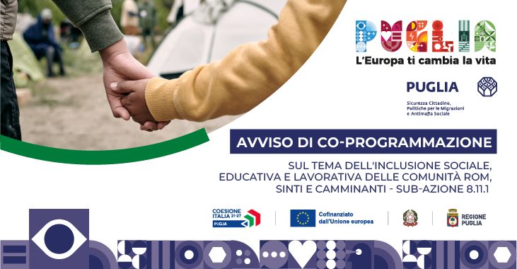Con la presente manifestazione di interesse, la Sezione Sicurezza del Cittadino, Politiche per le Migrazioni e Antimafia Sociale di Regione Puglia, invita gli Ambiti Territoriali Sociali della Regione Puglia, interessati dalla presenza di comunità Rom, Sinti e Camminanti sul proprio territorio, a partecipare ad una seduta di co- programmazione, utile ad approfondire il quadro conoscitivo della presenza nomade e stanziale sul territorio pugliese e a co-definire le linee di intervento da valorizzare all’interno della sub azione 8.11.1 del PR Puglia 2021-2027 - Misure volte a migliorare l’accesso ai gruppi emarginati (come i Rom) all’istruzione e all’occupazione e a promuoverne l’inclusione sociale.