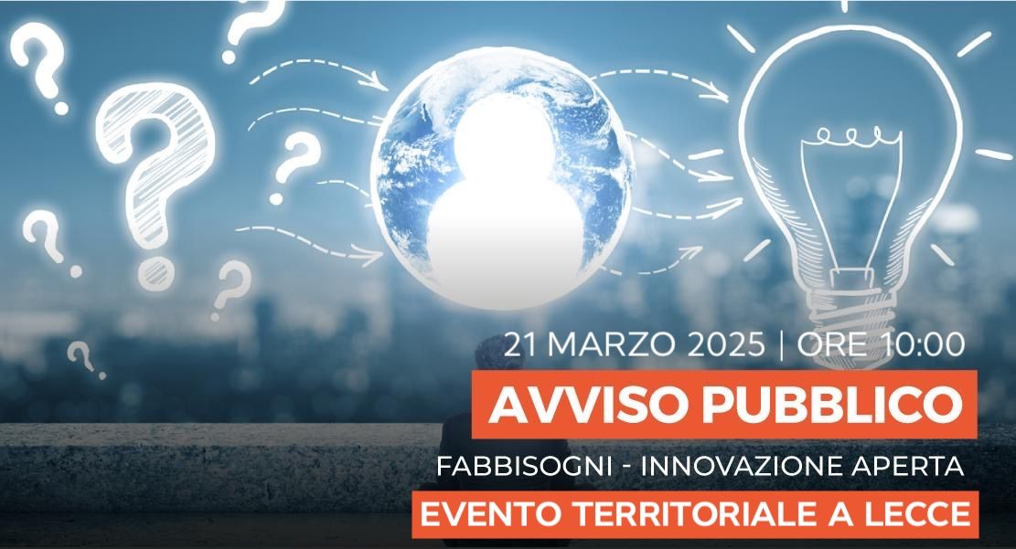 Il 21 marzo 2025 alle ore 10:00 si terrà presso la Sala Conferenze della Camera di Commercio di Lecce, in viale Gallipoli n. 39, l’evento territoriale di presentazione dell’Avviso pubblico "Fabbisogni", promosso nell’ambito dell’intervento "Innovazione Aperta" dal Dipartimento Sviluppo Economico della Regione Puglia(Sezione Ricerca e Relazioni Internazionali) e organizzato in collaborazione con la Camera di Commercio di Lecce, InnovAAL e I-Store Unisalento.